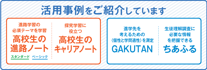 高等学校における進路指導・キャリア教育、生徒指導、基礎学力養成指導を支援するための商品・サービスをご案内いたします。ご注文は、学校単位での一括採用に限らせていただきます。