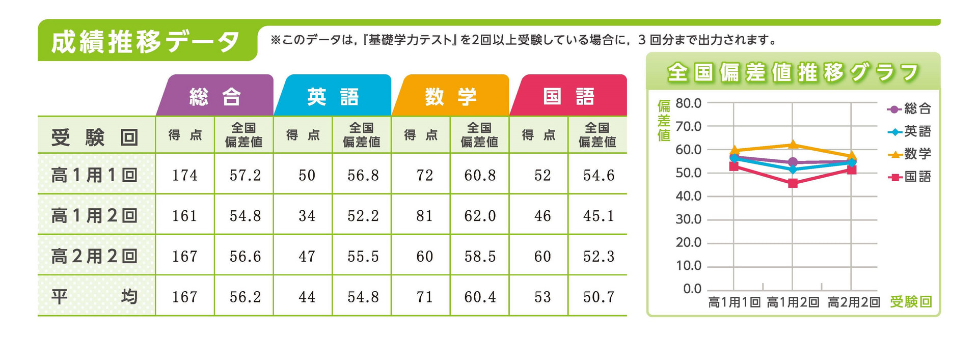 『基礎学力テスト』は、 英語・数学・国語の基本3教科について、高校前段階の基礎に立ち返っての学力の総点検、弱点の補強など、基礎固めに有効な比較的やさしいレベルの学力テストです。また、問題が解けることで生徒に自信を持たせ、学習意欲を啓発することができます。