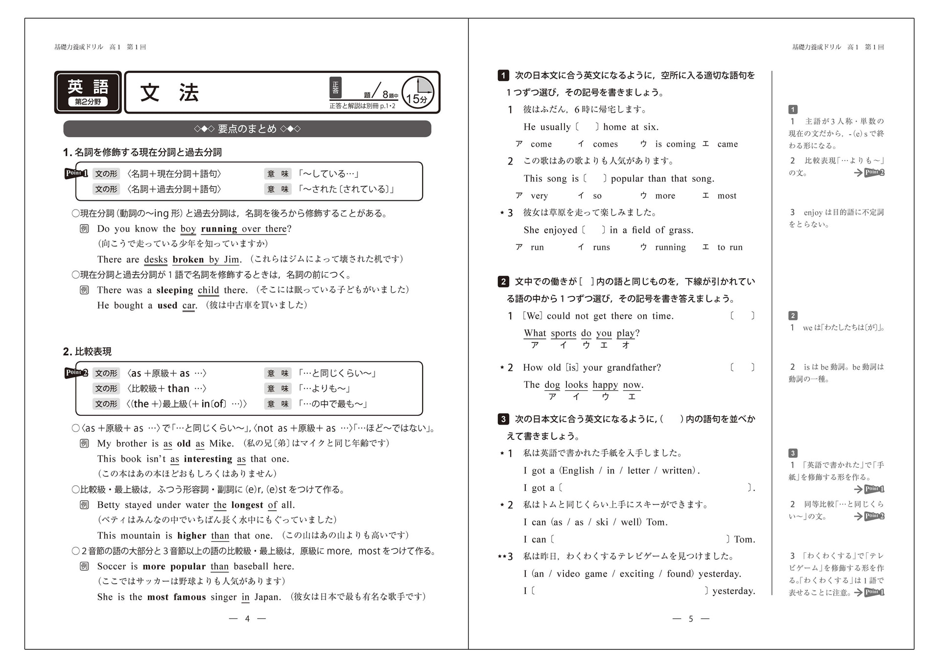 - 補習教材「基礎力養成ドリル」はテストの出題分野と同じ分野で問題を出題。練習問題と発展問題で構成しており、テスト前の学習課題や事後の弱点補強にご活用いただけます。