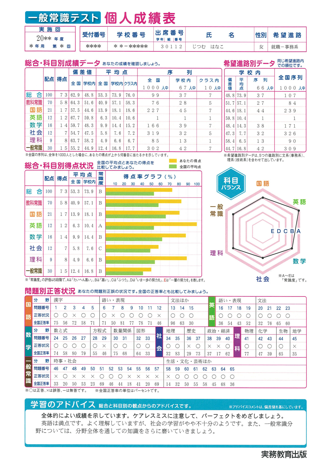 『一般常識テスト』は、基礎に徹した平易なレベルでの出題のため、基本的な学力の確認とともに、学習意欲の低下を引き起こしている生徒へのやる気を喚起し、学習への動機づけを図ることができます。進学、就職の全進路について、 高校生必須の一般常識を身につけられるテストです。