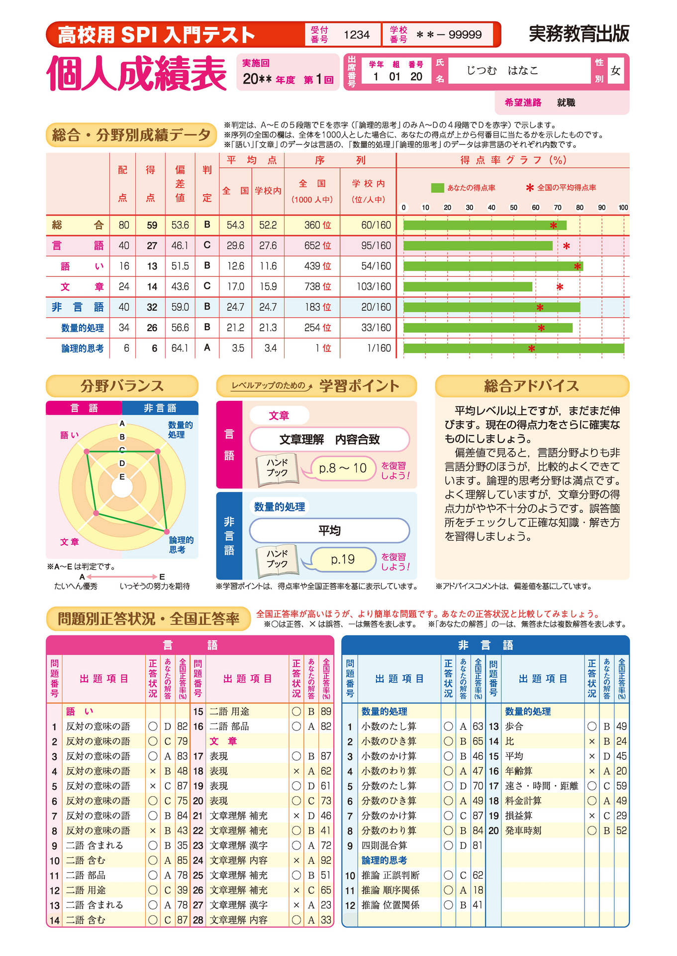 『SPI入門テスト』は、「SPI」対策を無理のないレベルからスタートさせることができるよう、頻出分野について初歩的な問題で構成したテストです。初めて触れる生徒にも学習継続のための自信や動機を付けさせることができます。