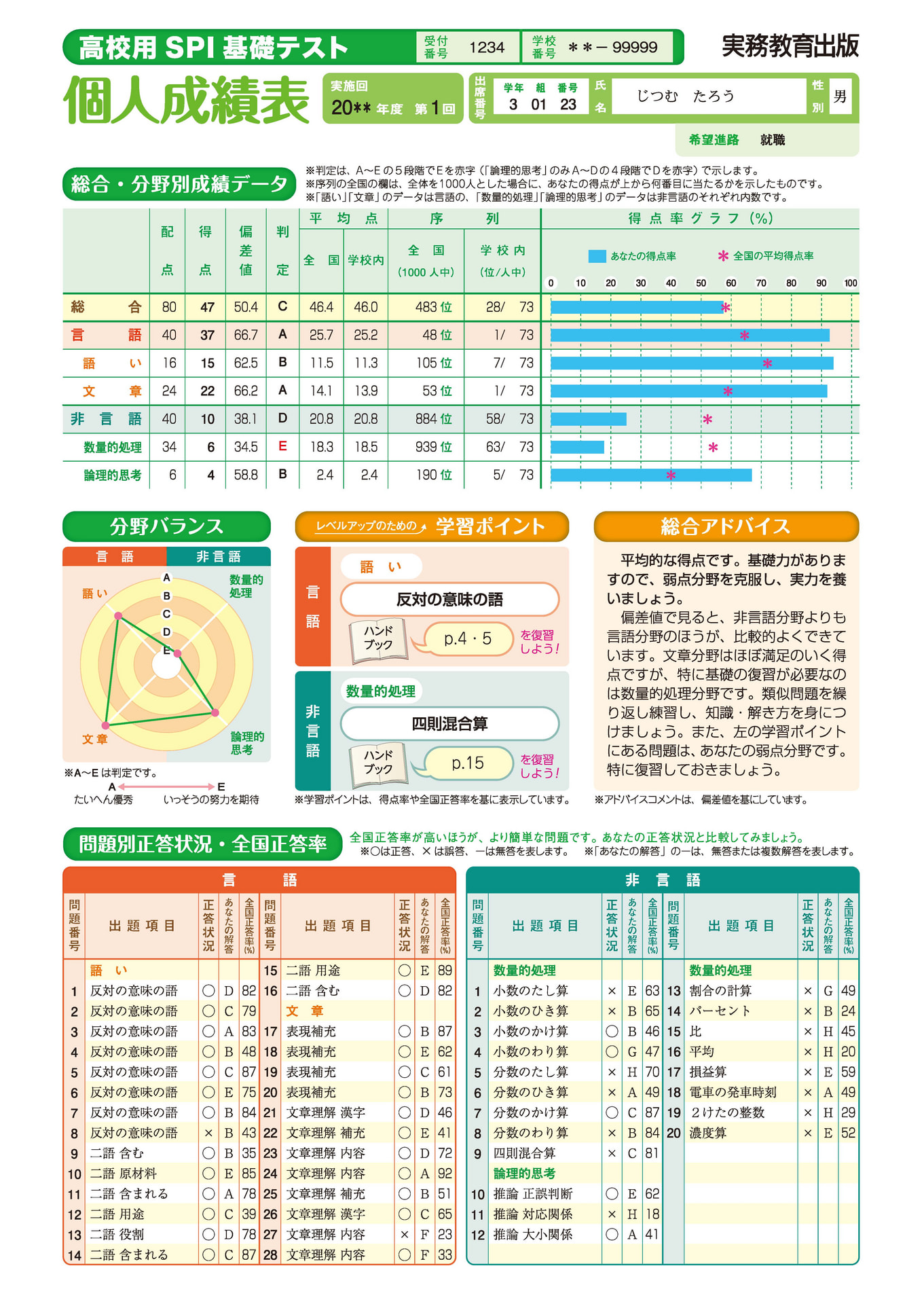 『SPI基礎テスト』は、「SPI」能力検査の傾向を踏まえつつ、出題頻度の高いジャンルから基礎的な問題を精選して構成したテストです。弱点補強・得点力アップの指針を得られ、基礎固めにお役立ていただけます。