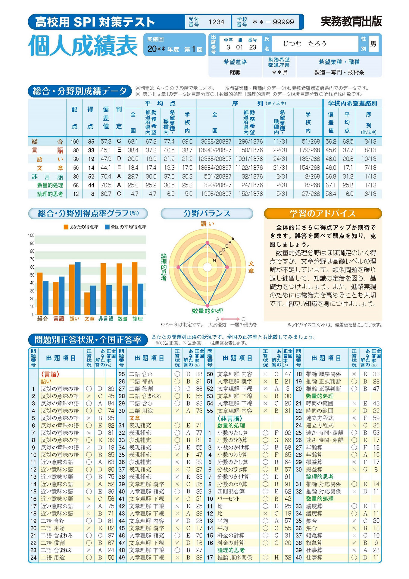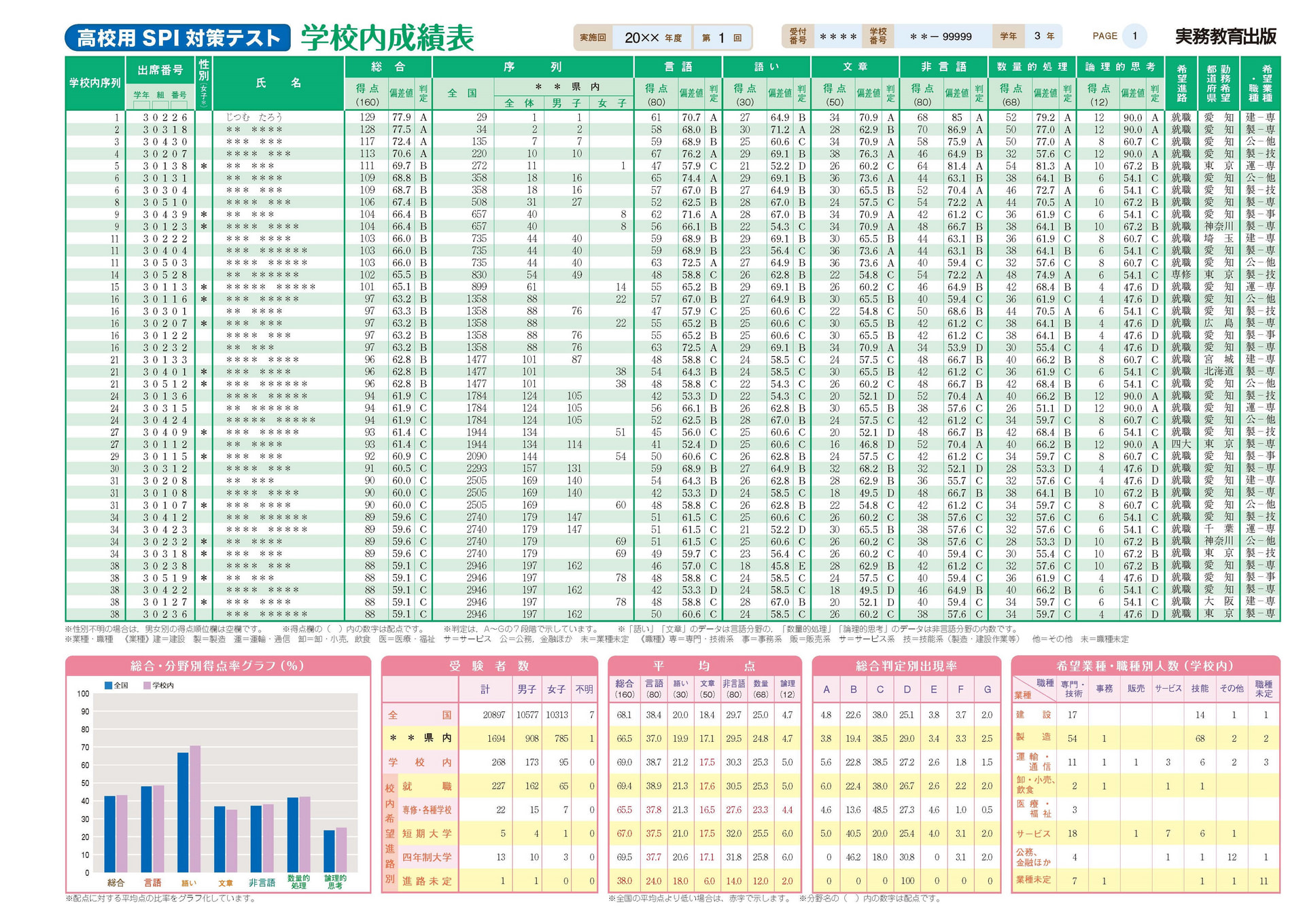 個人成績表(2部打出:受験者用・教師用)、学校内成績表(教師用)、クラス内成績表(教師用) |