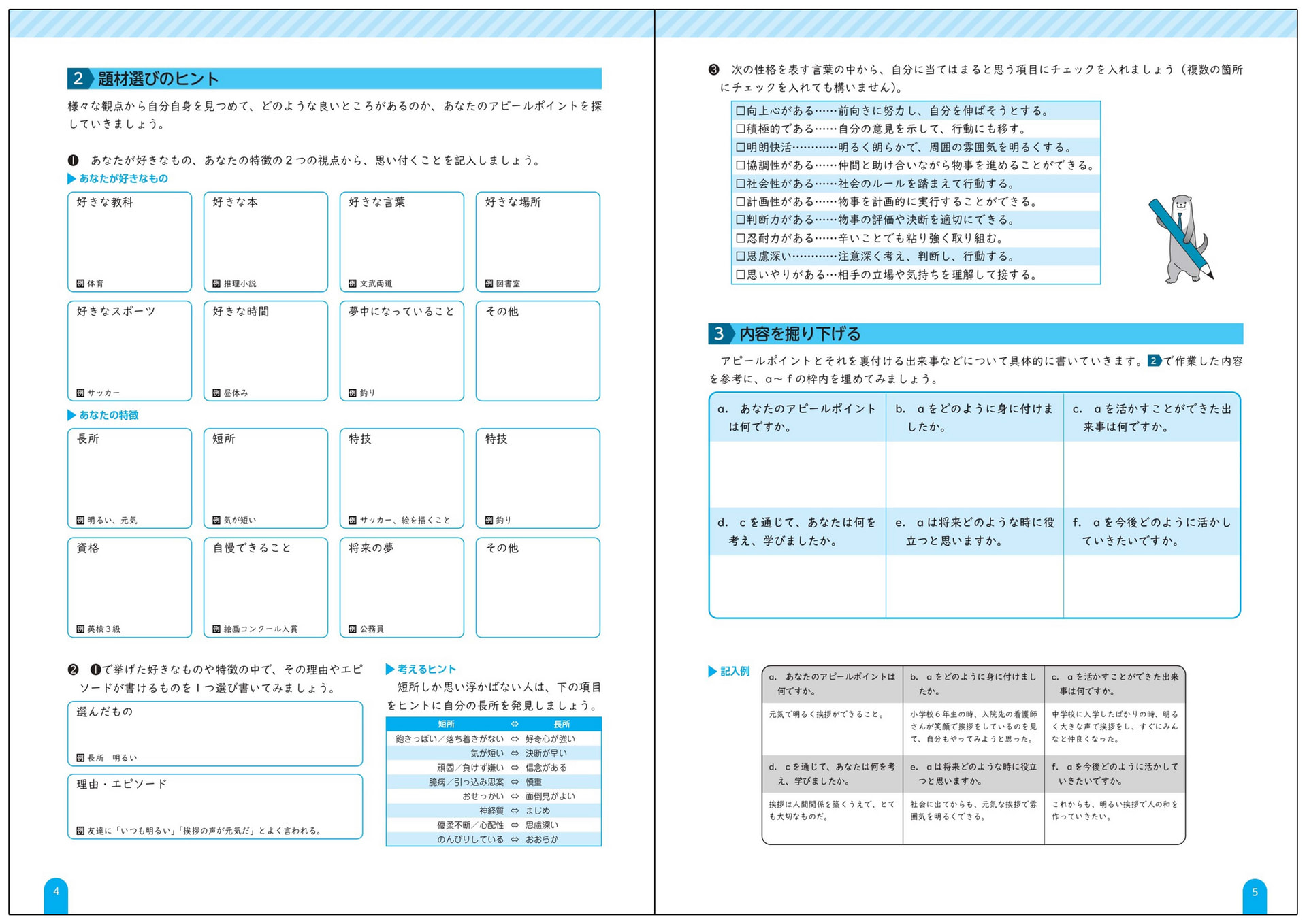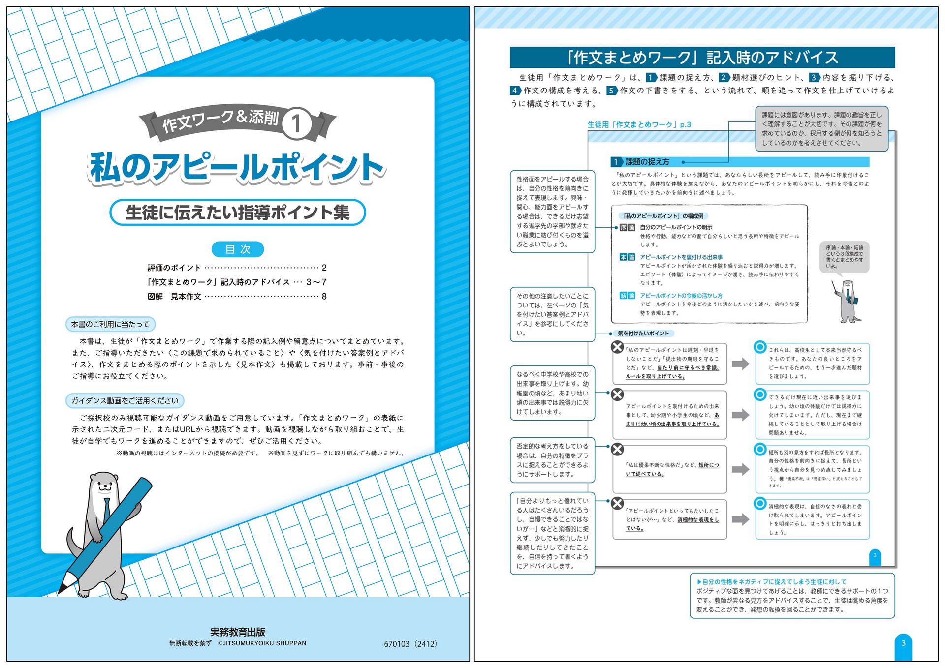教師用マニュアル「生徒に伝えたい指導ポイント集」付き。「作文まとめワーク」の記入例や留意点を掲載しており、生徒の学習を深め、考えを引き出す手助けをします。