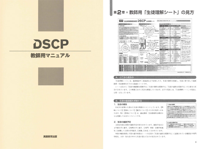 生徒理解シート(教師用)、アドバイスシート(生徒用)、一覧表(教師用)、統計表(教師用)、DSCP職業ブック(生徒用)、マニュアル(教師用) |