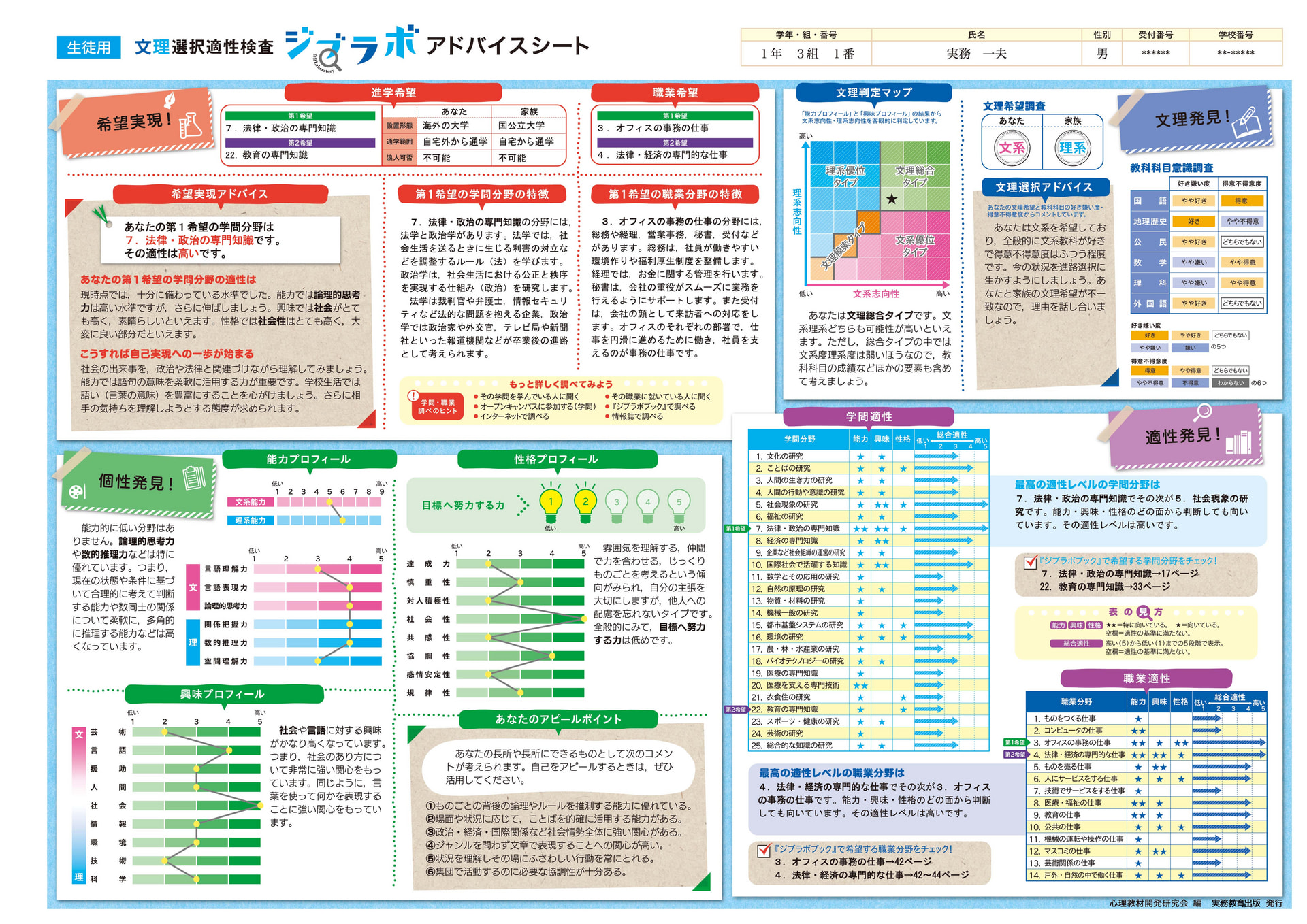 『文理選択適性検査ジブラボ』は、主に中堅大学進学を希望する生徒を対象とした適性検査です。文理選択、教科科目選択の際に参考になるデータを提供します。学問適性だけでなく、職業適性も判定する点が特色となっています。
