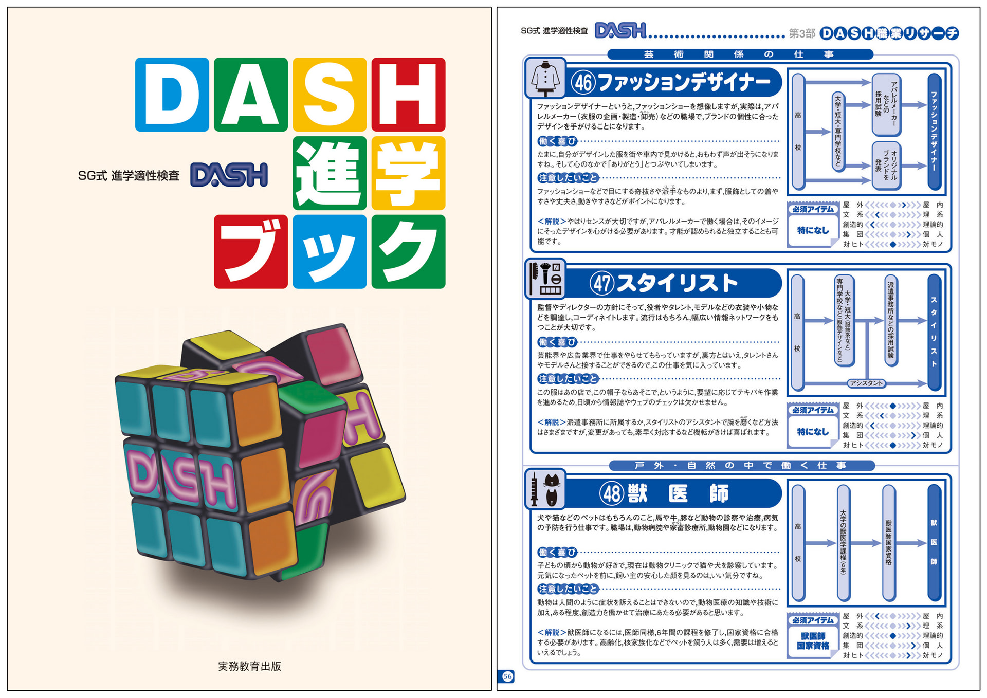 「DASH進学ブック」は、判定結果の見方や進路設計のためのワークに加えて、〈学問リサーチ〉〈職業リサーチ〉〈資格・検定リサーチ〉の4部構成で、生徒自身で進路学習をすることができます。