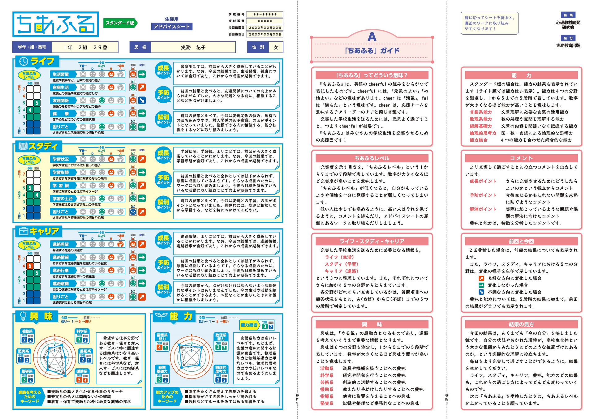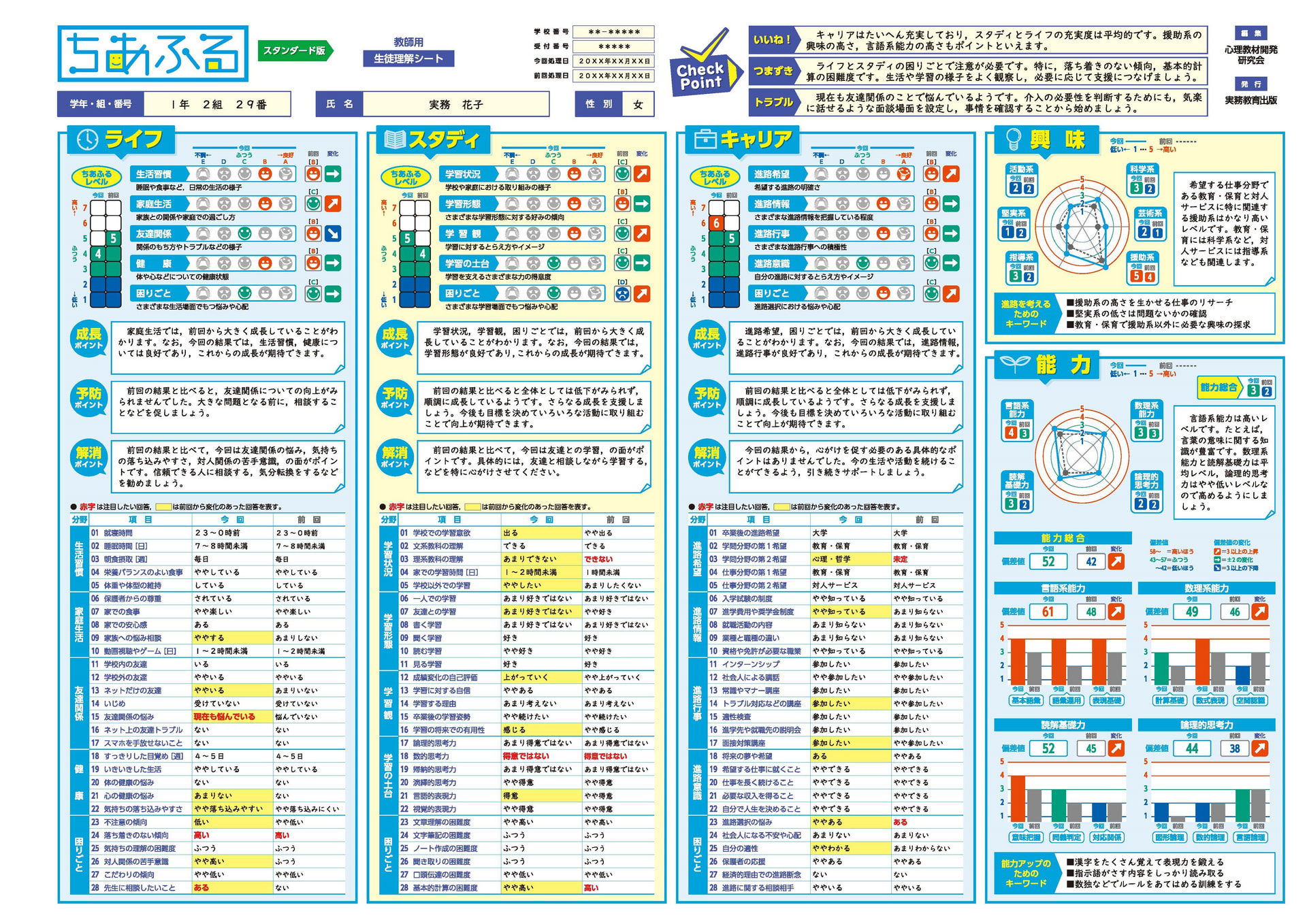 | 検査の概要 | ※検査1[ライト版][スタンダード版]共通 ●ライフ(生活)に関する調査 生活習慣、家庭生活、友達関係、健康、困りごと ●スタディ(学習)に関する調査 学習状況、学習形態、学習観、学習の土台、困りごと ●キャリア(進路)に関する調査 進路希望、進路情報、進路行事、進路意識、困りごと ●興味に関する調査 活動系、科学系、芸術系、援助系、指導系、堅実系に対する興味 ※検査2[スタンダード版]のみ ●基礎能力に関する検査 言語系能力、数理系能力、読解基礎力、論理的思考力 |