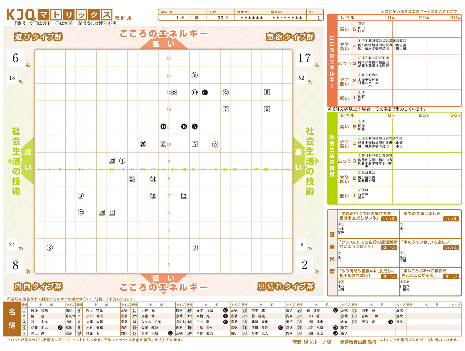 『KJQマトリックス』は、〈いじめ〉〈不登校〉など、クラス集団で生じる問題の早期発見・指導に役立つデータを提供する、予防的生徒指導のための検査教材です。