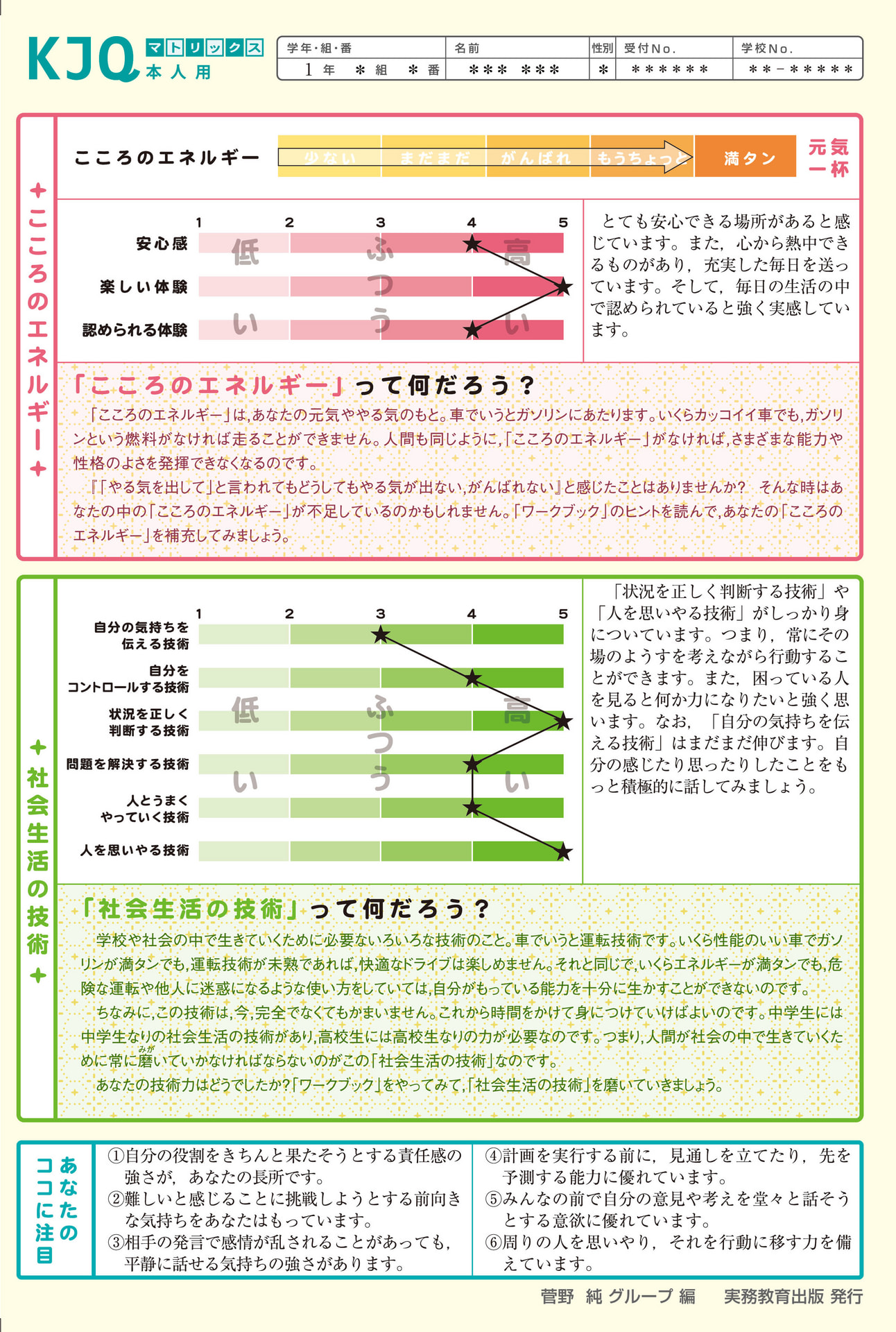 KJQマトリックスシート(教師用)、教師用シート(教師用)、本人用シート(児童生徒用)、回答状況シート(教師用)、一覧表・統計表(教師用)、ワークブック(児童生徒用)、マニュアル(教師用) |