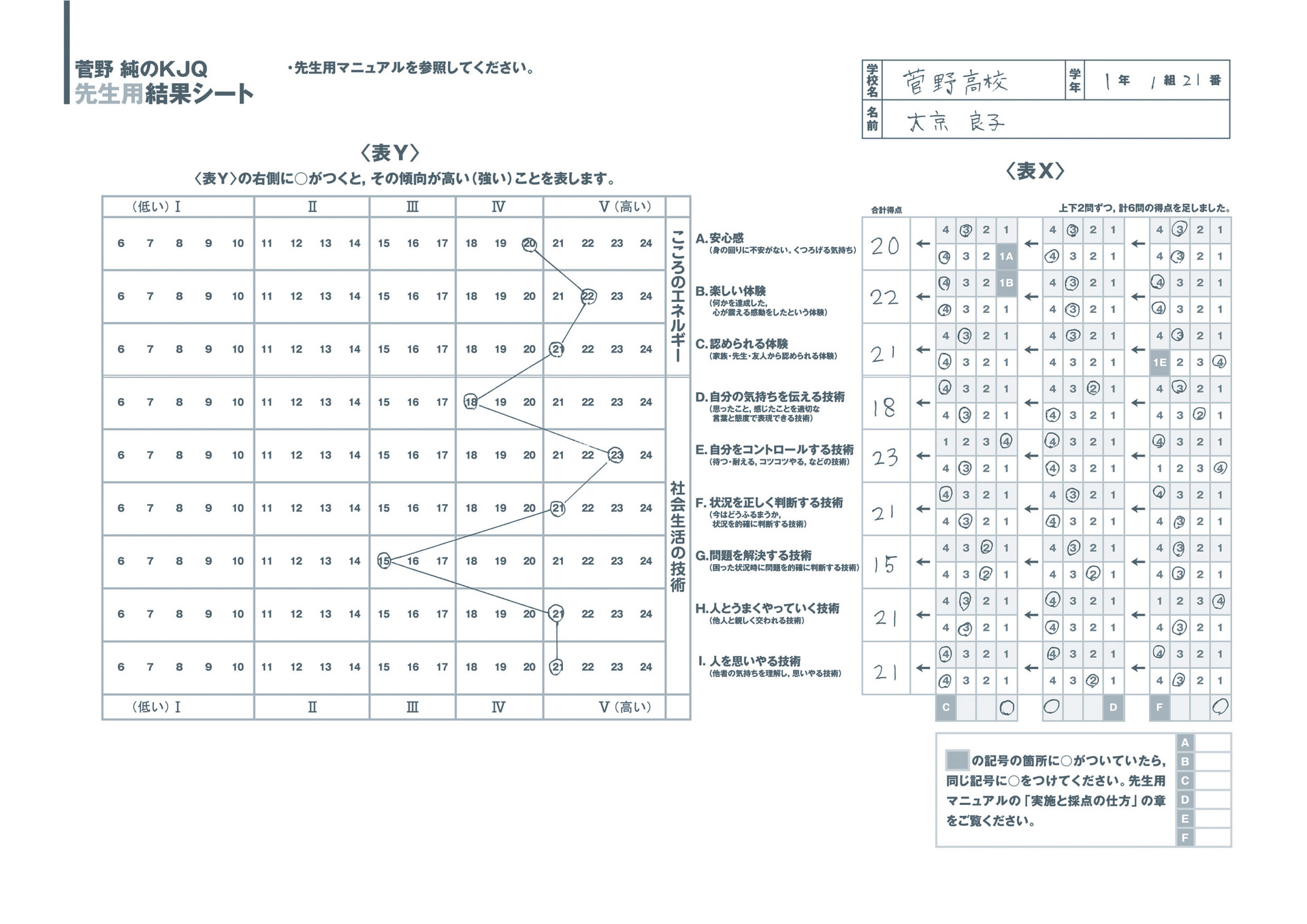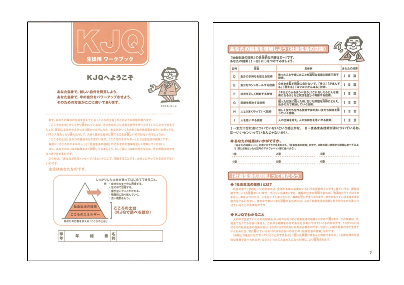 『菅野純のKJQ調査』は、自己理解を助け、前向きな力を引き出す自己採点式の検査です。 調査結果をもとにワークブックで〈生きる力〉を引き出します。