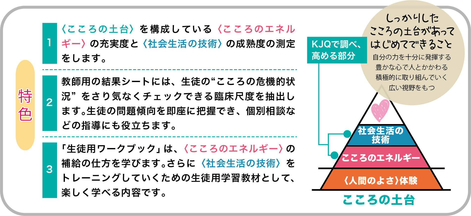 | 検査の概要 | ※複写式・自己採点方式 ●〈こころのエネルギー〉を測定 安心感、楽しい体験、認められる体験 ●〈社会生活の技術〉を測定 自分の気持ちを伝える技術、自分をコントロールする技術、状況を正しく判断する技術、問題を解決する技術、人とうまくやっていく技術、人を思いやる技術 |