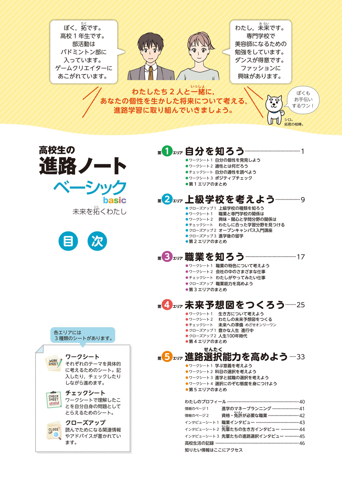 『高校生の進路ノート ベーシック』は、進路学習の基本となる5つのテーマを、イラストや漫画でビジュアルに展開する、〈入門編〉の教材です。わかりやすいアプローチで、楽しく進路について考えることができます。