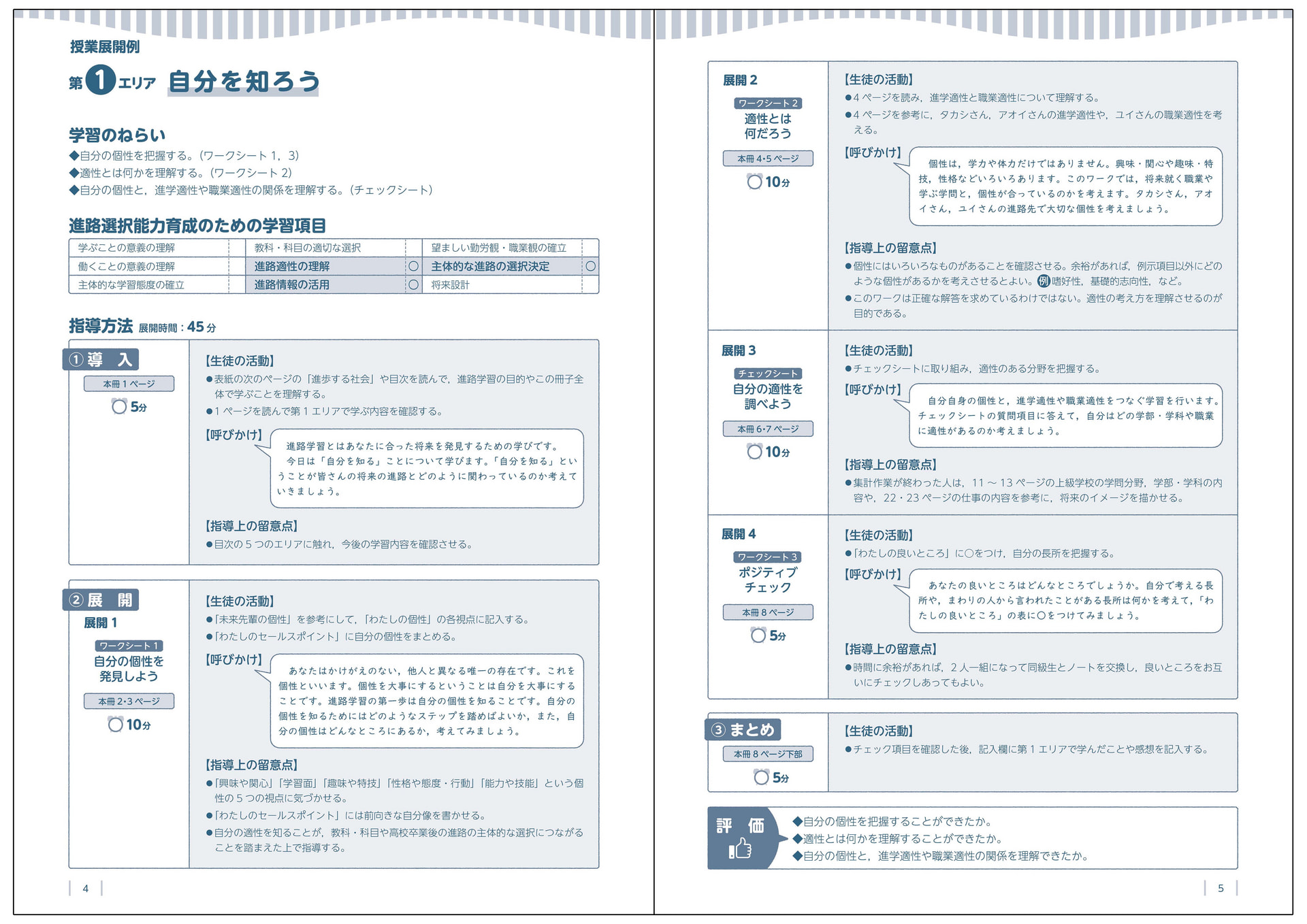 学習内容を、生徒には理解しやすく、先生方にも展開しやすいよう噛み砕いて表現しました。各テーマとも、45分で展開できる内容に絞ってありますので、少ない指導時間でも、やり残すことなく、進路学習の基礎固めができます。