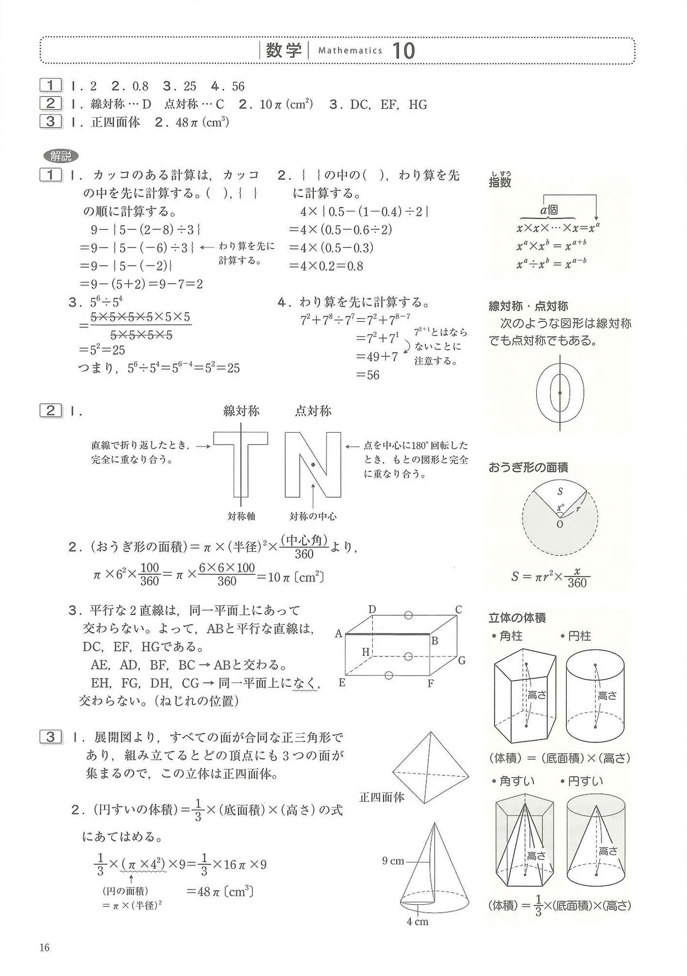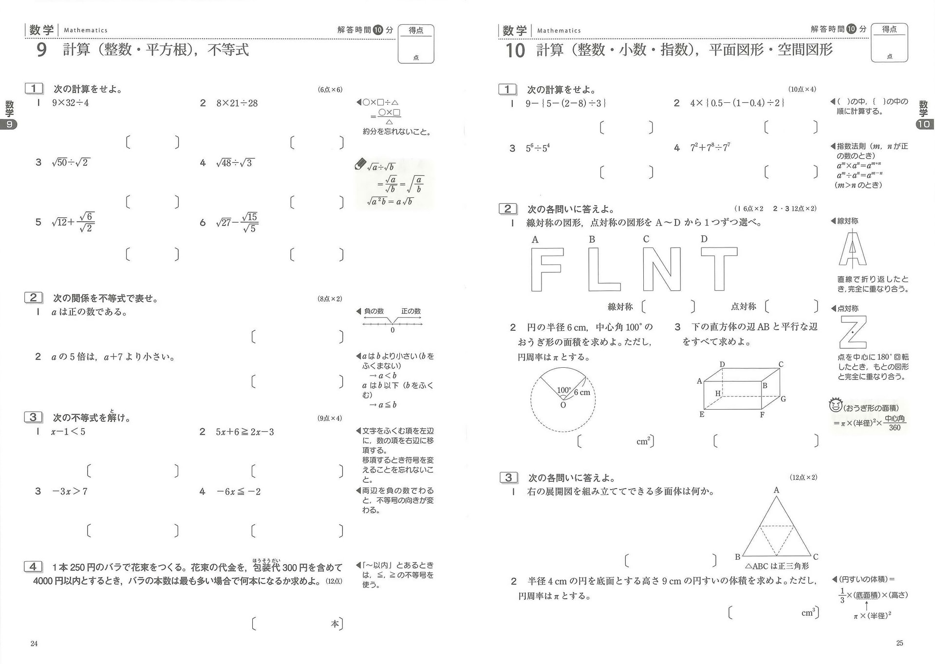 数学:整数・小数・分数・平方根の計算/割合・比/確率/平面図形・空間図形 他