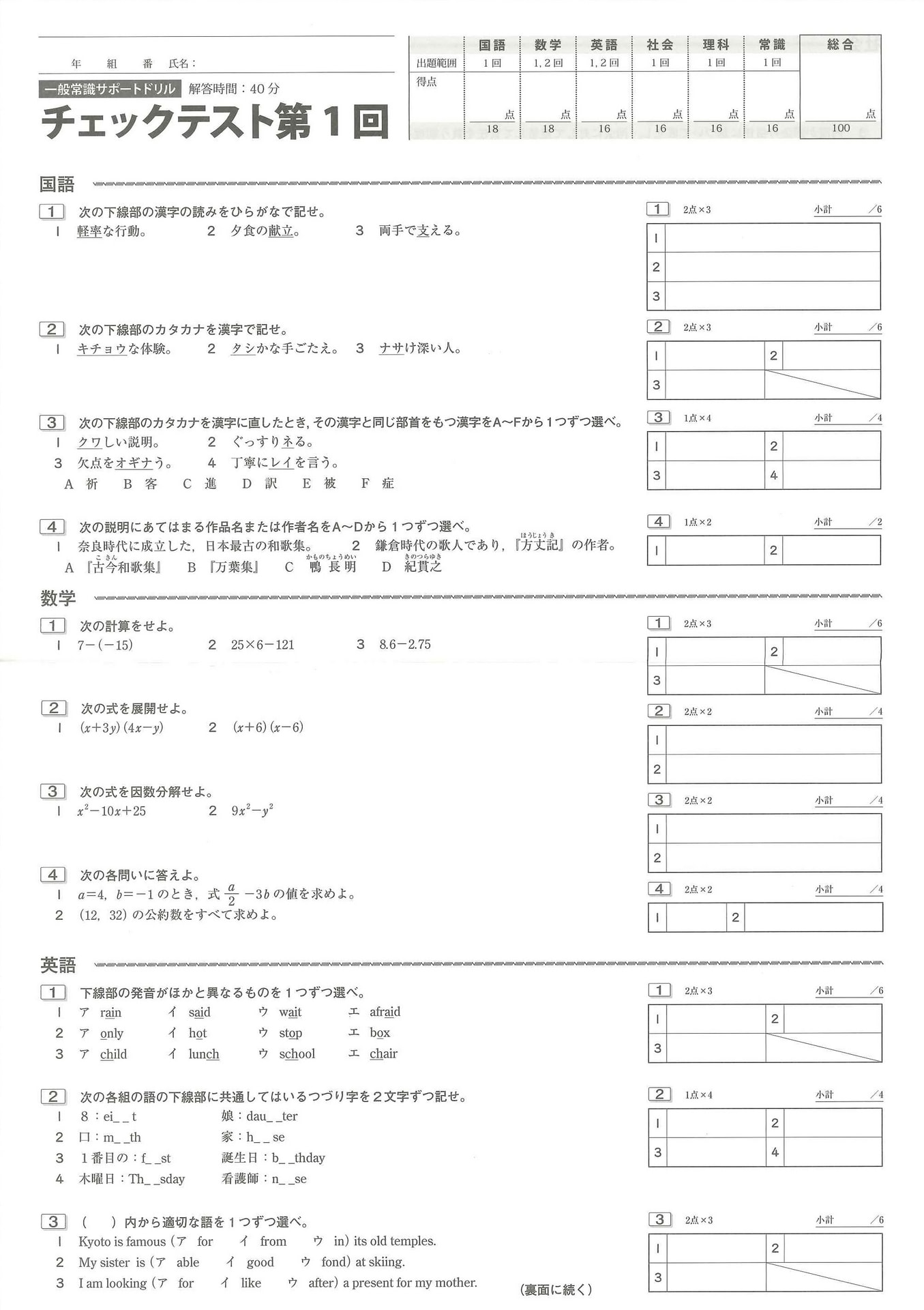 基本5教科に〈時事常識〉〈社会常識〉〈生活常識〉を加えた構成で、中学校卒業までに学習した重要項目に絞って出題しています。