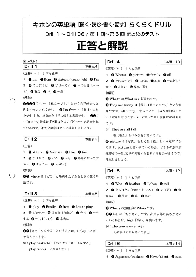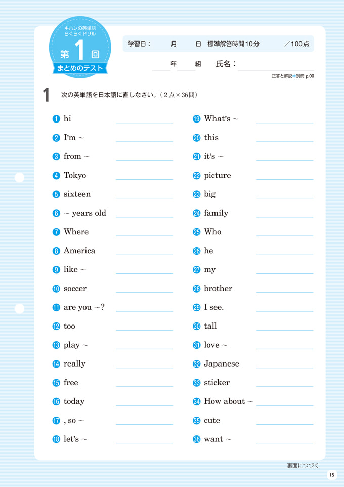 中学までに学習した〈これだけは身につけさせたい英単語〉216語を、36回分のドリルに収録しています。簡単な会話を通じて、英語の単語が自然と理解できるようになります。