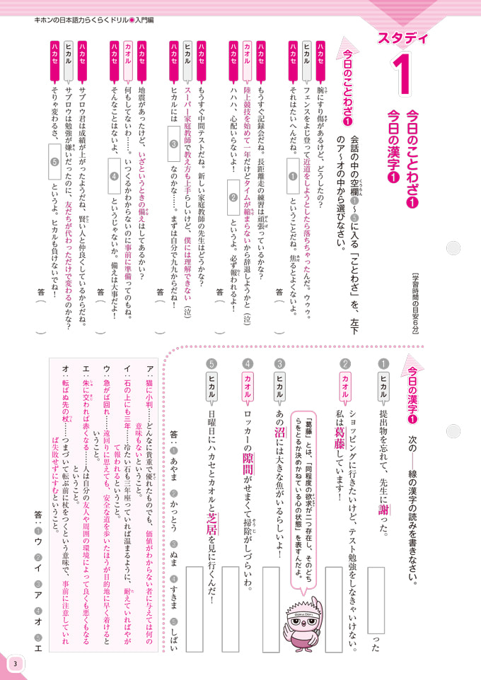 日本語に楽しく親しめるよう、高校生に身近な〈チャット形式の話し言葉〉で出題しています。〈入門編〉、〈基礎編〉、〈標準編〉の3つの段階に分かれており、楽しみながら学習を進めて〈語彙力〉を効果的に向上させることができます。