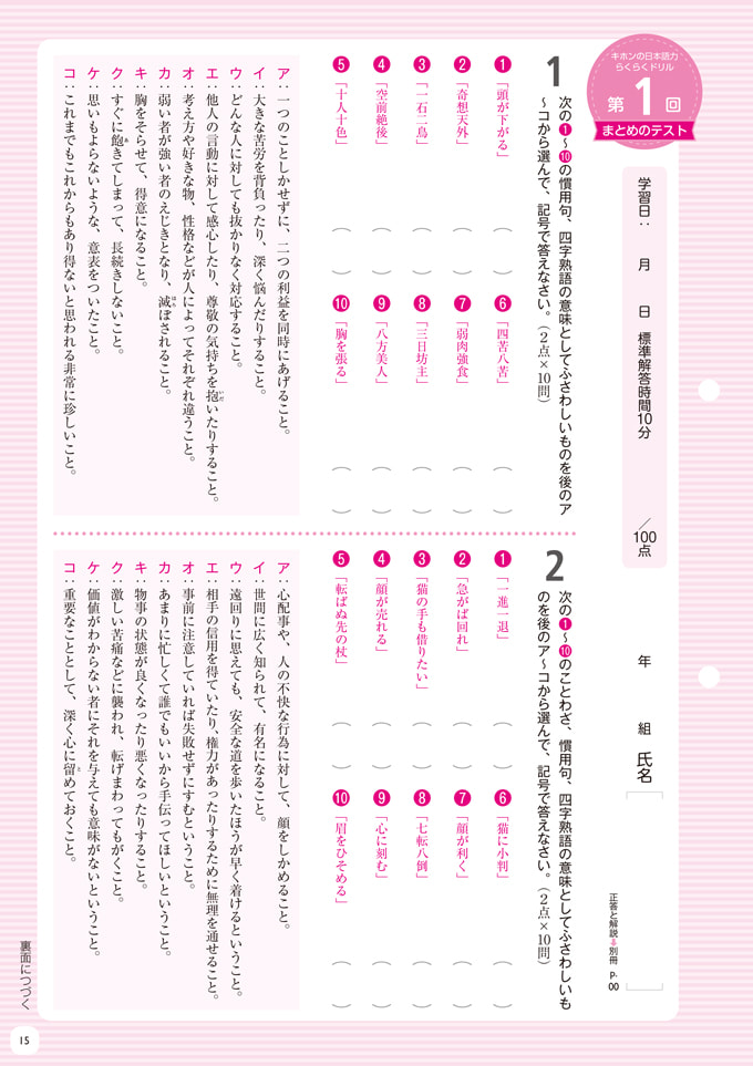 1回10分でできる分量で、それぞれ5問ずつ〈ことわざ・四字熟語・慣用句・故事成語・同音異義語の意味と使い方〉と〈漢字〉を網羅した構成になっています。