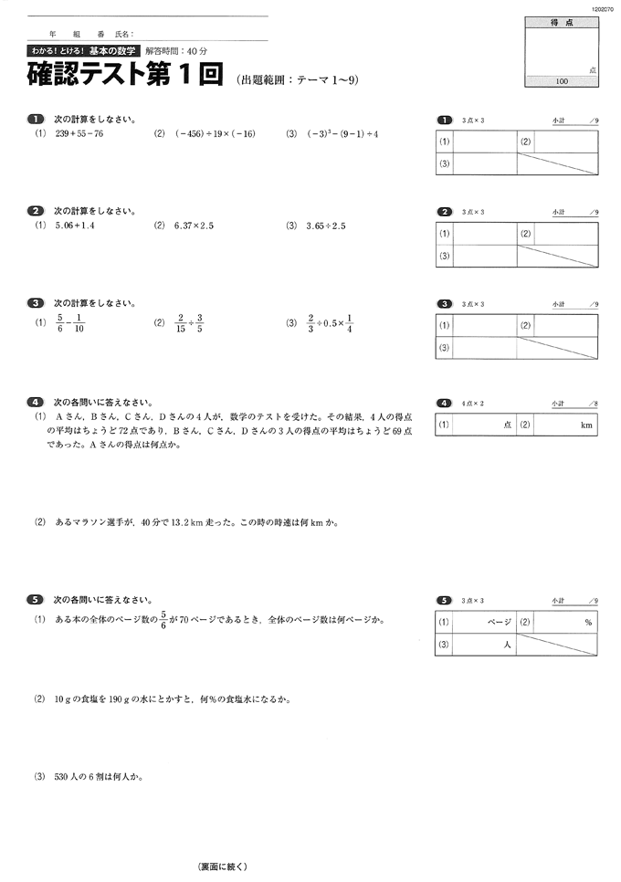 整数の計算/小数の計算/分数の計算/平均、速さ/割合/式の計算/式の展開、因数分解/平方根/1次方程式/比/連立方程式/2次方程式/1次関数/関数y=ax² /平面図形、空間図形/平行線と角、相似/円周角と中心角、三平方の定理