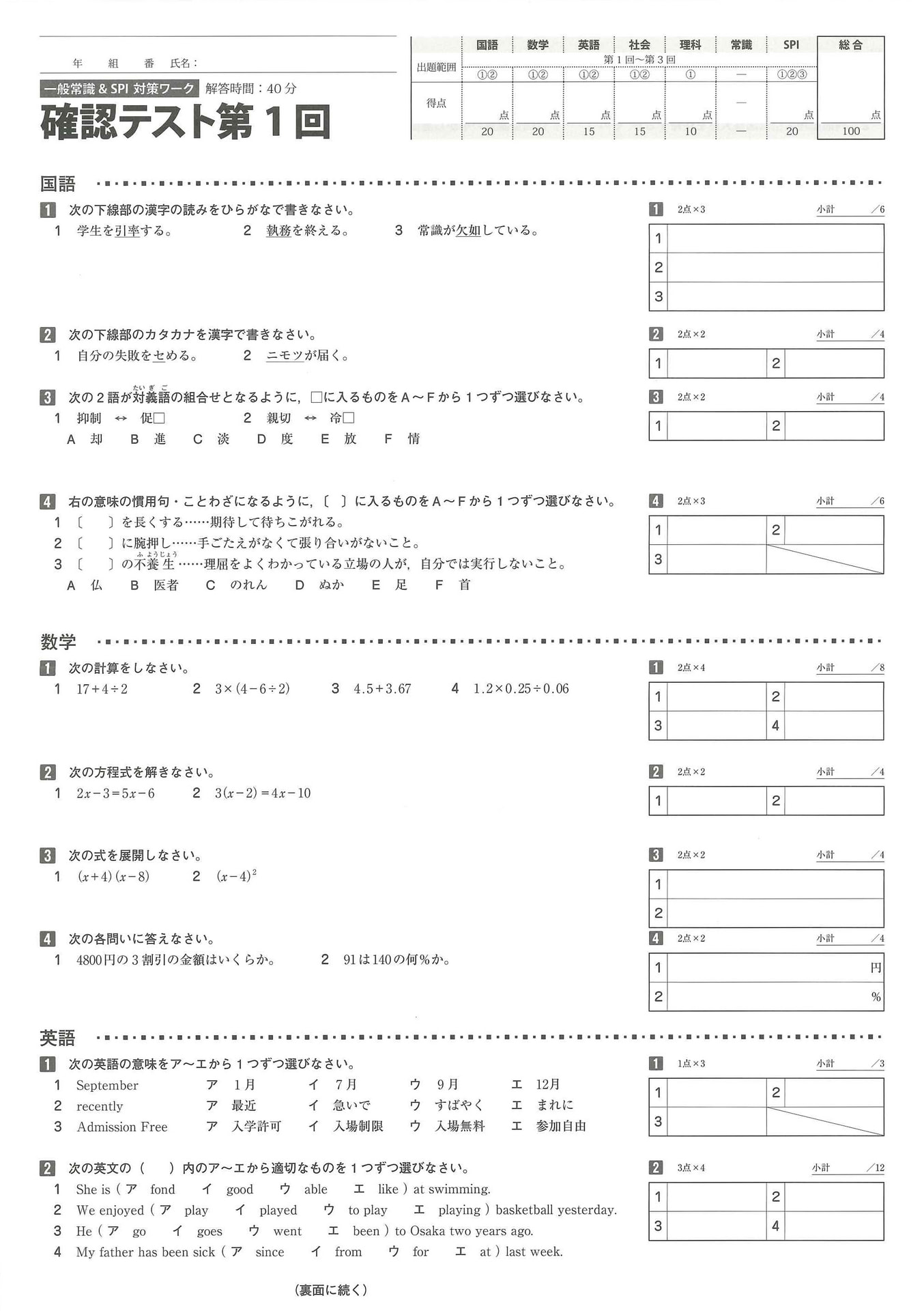 ワークで出題した問題の類似問題等で構成した「確認テスト(1回40分)」で学習の成果を確認でき、知識の定着・実戦力の養成に役立ちます。