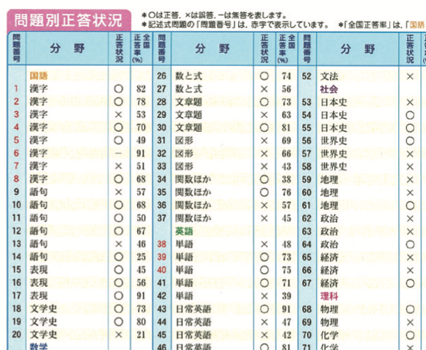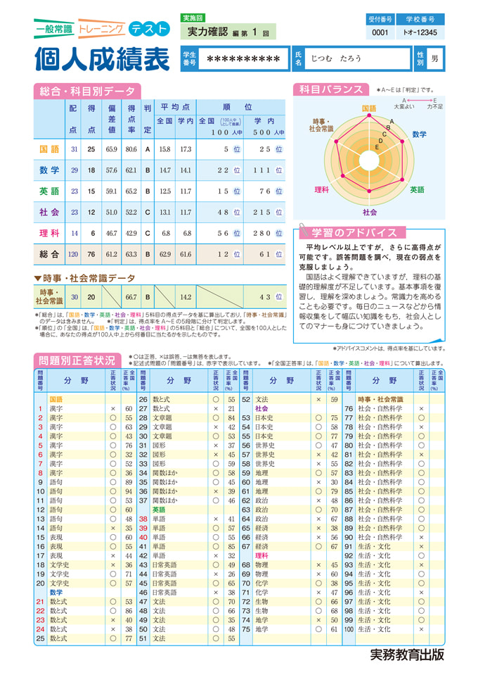個人成績表ではレーダーチャートやグラフを使い、問題別正答状況で苦手科目・弱点分野をわかりやすく示しています。学内成績表では各種集計データにより、学内の得意・不得意科目の傾向を把握することができます。また、全国の平均点や正答率と比較することで受験者の実力を客観的に把握できます。