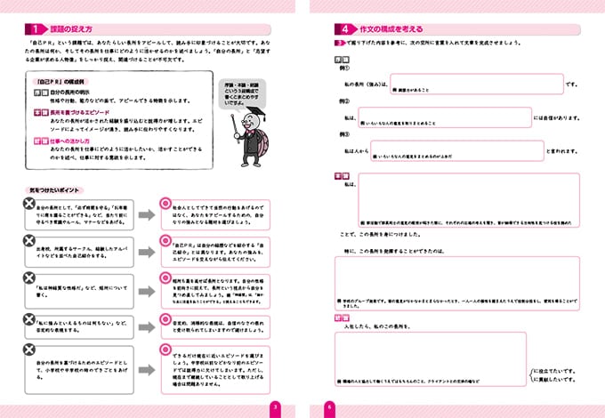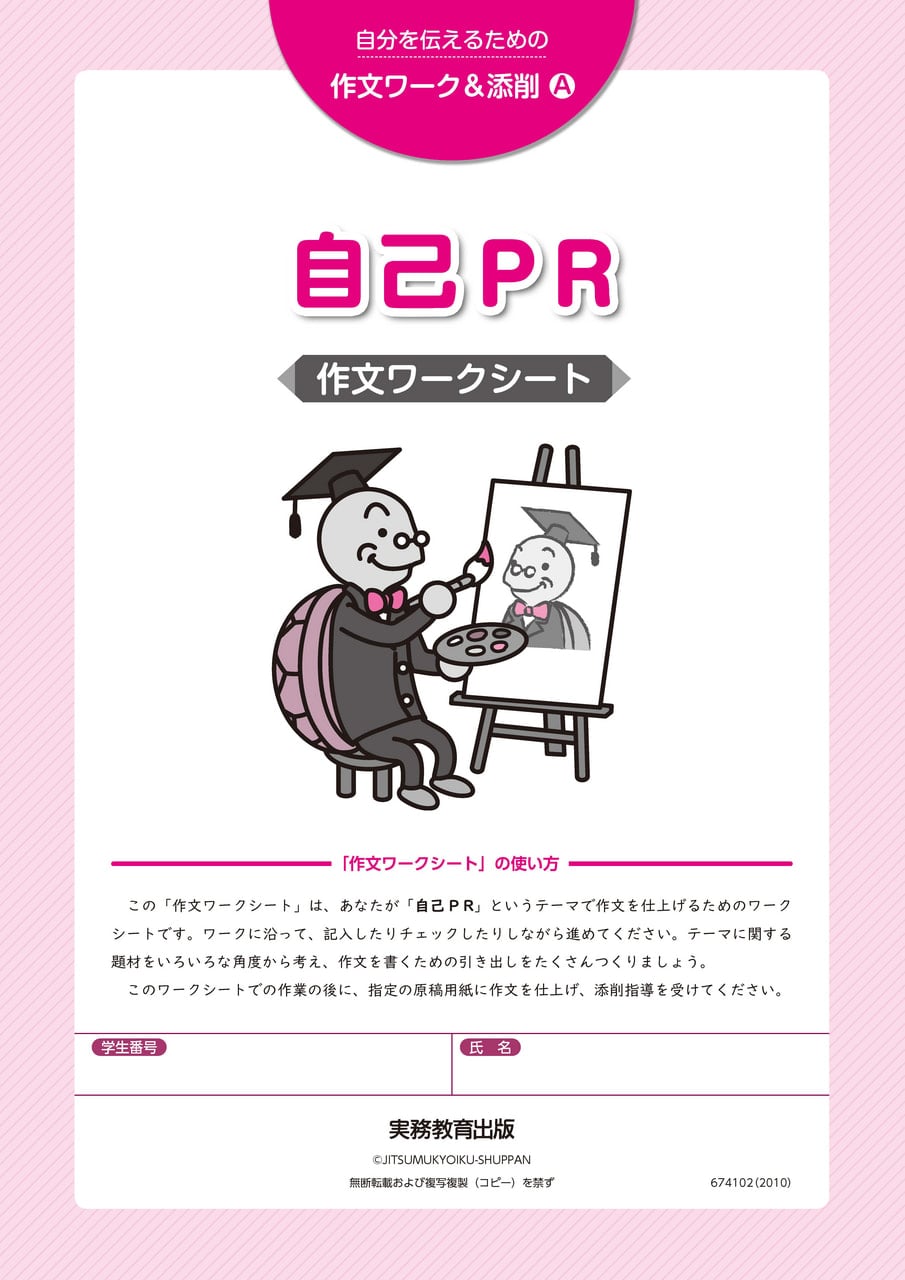 • 事前学習教材「作文ワークシート」は、穴埋め式のワークシートになっています。文章を書くことに苦手意識の高い学生でも、テキストに沿ってすすめることで、自己分析と題材集め、文章の展開を学習・整理することができます。