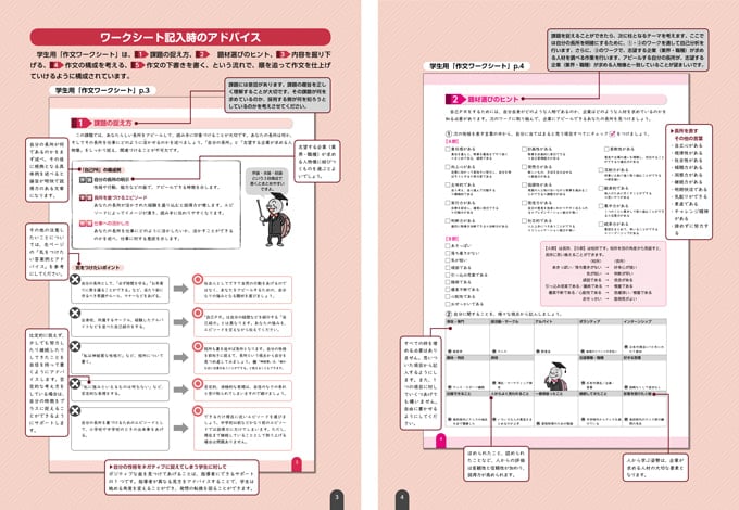 • 指導用マニュアル「学生に伝えたい指導ポイント集」は、「作文ワークシート」記入時のアドバイスを詳説しています。