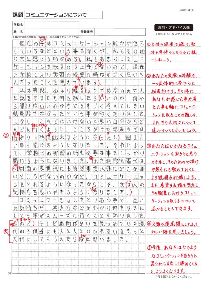 誤字・脱字や文法の誤り、原稿用紙の使い方、課題のとらえ方、文章の構成等について、細やかなアドバイスをいたします。文章を書く自信につながるよう、懇切丁寧な添削指導で〈書く力〉〈考える力〉を育てます。