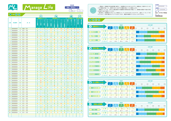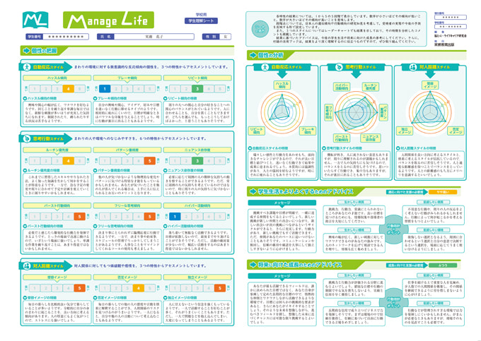 • 学校生活への適応・将来に向けた成長のための支援に役立つアドバイスを、さまざまな観点からコメントします。また、学生の素質および環境それぞれについての今後の行動指針を、生かしたい面と配慮したい面に注目してアドバイスします。