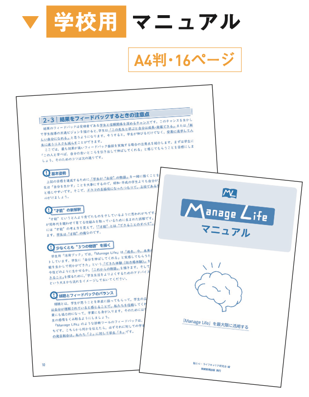 • 学校用のマニュアルには、判定シートの見方、面談・グループワークでの資料活用方法、結果資料をフィードバックする際の注意点などを掲載しています。場面にあわせてご活用ください。