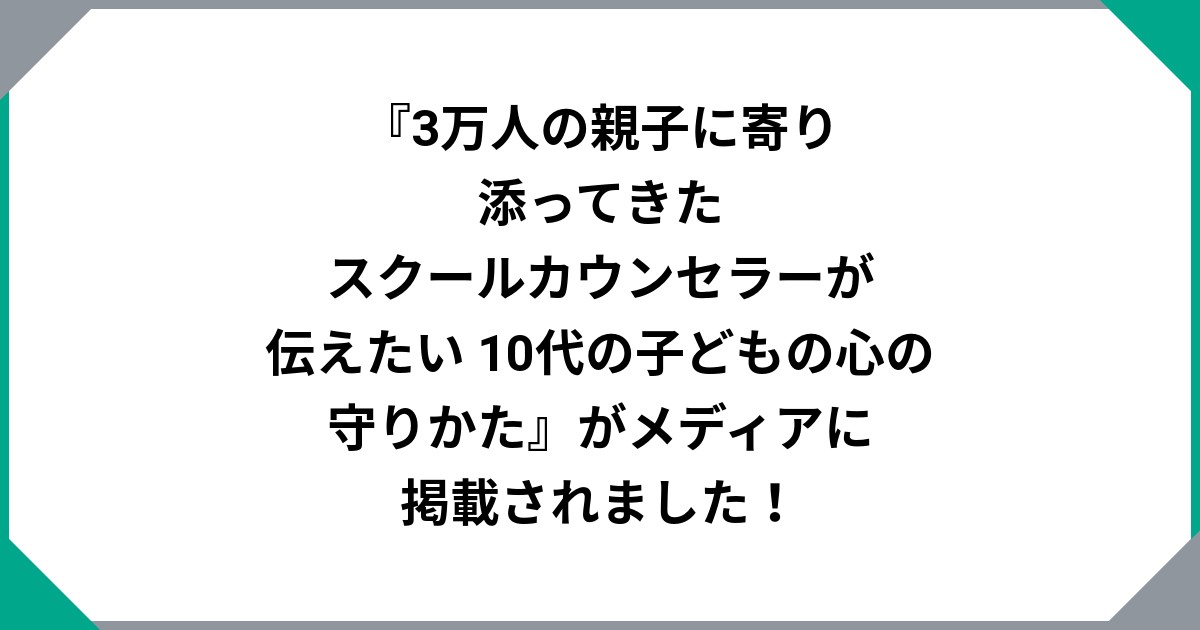 『3万人の親子に寄り添ってきたスクールカウンセラーが伝えたい 10代の子どもの心の守りかた』が、メディアに掲載されました!是非ご覧ください。