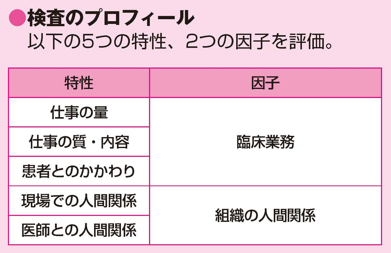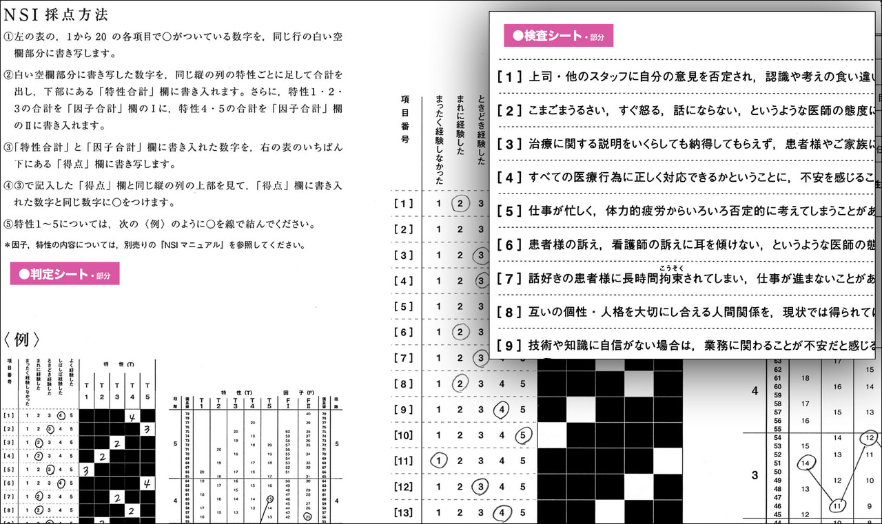 | 検査用紙(複写式) | 「仕事の量」「仕事の質・内容」「患者とのかかわり」「現場での人間関係」「医師との人間関係」を20項目の質問事項で査定。 |
